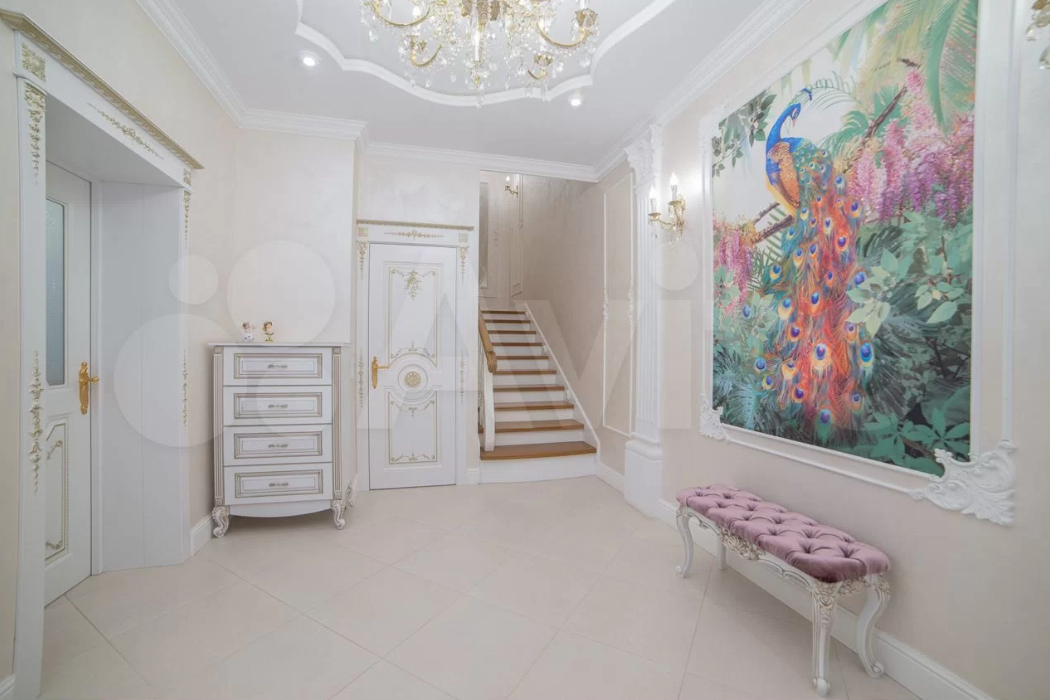 В Академическом районе Екатеринбурга выставили на продажу пятикомнатную квартиру в таунхаусе на пять квартир. Её площадь составляет 260 квадратных метров. Помещения располагаются на четырех этажах. В квартире выполнен дизайнерский ремонт и остается мебель. Все в бело-розово-золотистых тонах. На стенах расположились панно с павлинами. Стоимость объекта недвижимости заявлена в 28 миллионов рублей, что делает её сопоставимой с ценой коттеджей и элитных квартир в центре города. Объявление размещено на сайте «Авито Недвижимость».