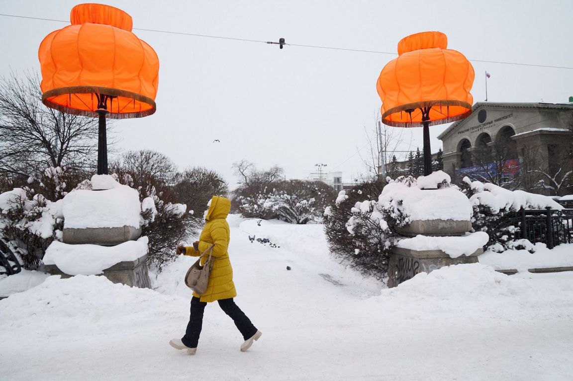В Екатеринбурге уличный художник Тимофей Радя вновь украсил фонари на аллее у театра «Урал Опера Балет» оранжевыми абажурами. Их установили во вторник, 7 января.