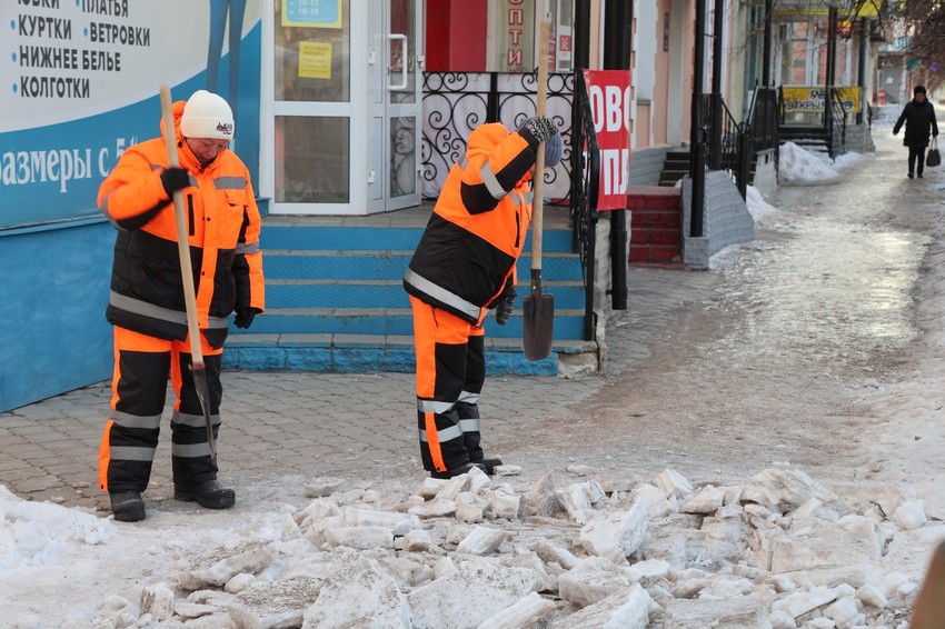 Причина – температурные качели: днем воздух прогревался до плюсовых показателей, снег таял – ночью всё замерзало. Поэтому еще в выходные дни подрядные организации управления городского хозяйства активно очищали от наледи в первую очередь пешеходные переходы, перекрестки, остановки, тротуары, треугольники видимости.