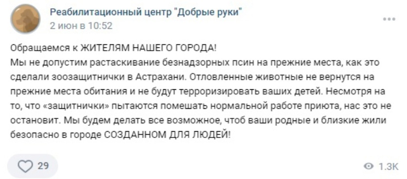 «Мы не допустим растаскивания безнадзорных псин на прежние места, как это сделали зоозащитнички в Астрахани. Отловленные животные не вернутся на прежние места обитания и не будут терроризировать ваших детей. Несмотря на то, что “защитнички” пытаются помешать нормальной работе приюта, нас это не остановит. Мы будем делать всё возможное, чтобы ваши родные и близкие жили безопасно в городе, созданном для людей!» — говорится в сообщении.