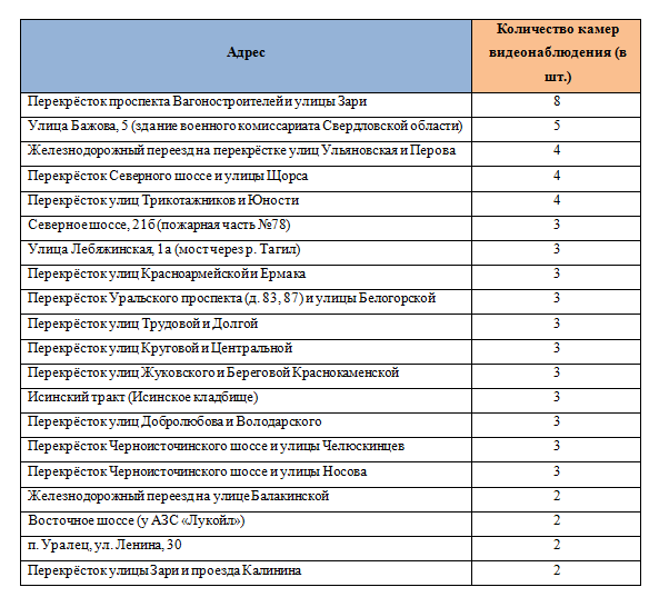 По контракту в разных районах города смонтируют 20 комплексов слежения из 57 камер. В зависимости от важности и размера объекта, подрядчик установит от 2 до 8 камер. Так, по 2 камеры появятся на железнодорожном переезде на улице Балакинская, у АЗС «Лукойл» на Восточном шоссе, перекрёстке улицы Зари и проезда Калинина, а также в посёлке Уралец на улице Ленина. Больше всего камер установят на перекрёстке проспекта Вагоностроителей и улицы Зари — 8 штук. Ещё 5 смонтируют вокруг военкомата на улице Бажова, где камеры не смогут фиксировать нарушения ПДД, но обеспечат полный обзор вокруг здания на 360 градусов. Можно предположить, что камеры поставят в антитеррористических целях. С полным списком мест, где появятся системы видеослежения, можно ознакомиться в таблице.