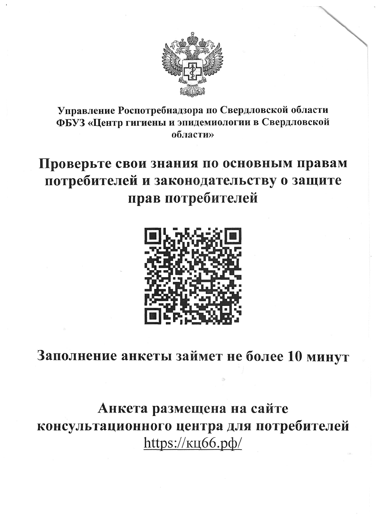 Анкета создана с помощью “Yandex Forms” и размещена на сайте консультационного центра для потребителей https://кц66.рф/ . Для заполнения анкеты необходимо пройти по ссылке https://forms.yandex.ru/cloud/6736794af47e730186c0b434/ или QR-коду в листовке