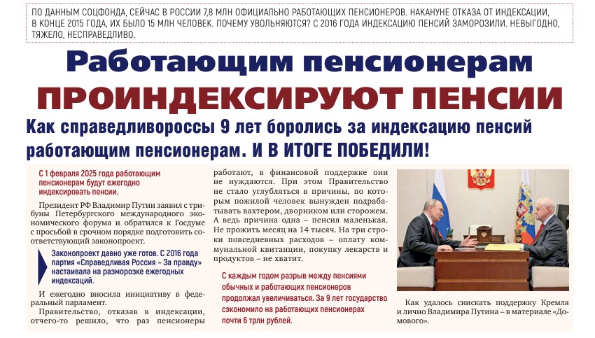 О пенсиях. С 1 февраля 2025 года пенсии будут индексировать всем пенсионерам. Так распорядился Президент РФ Владимир Путин. Работающие пенсионеры ждали этого решения почти девять лет. Все эти годы партия " СПРАВЕДЛИВАЯ РОССИЯ – ЗА ПРАВДУ " добивалась разморозки индексации. Все предложения социалистов отклонили, а от обязательств уклонились. Поддержал только Президент.